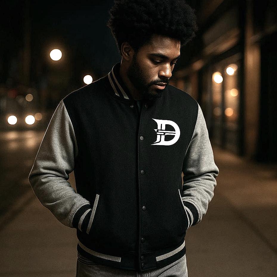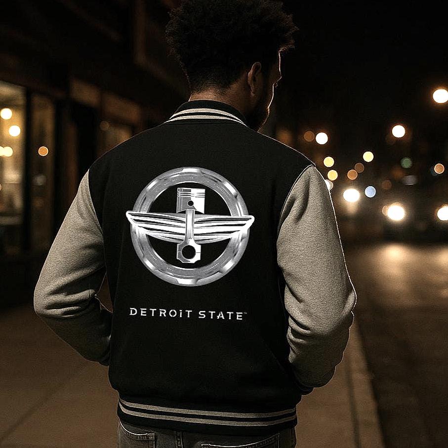 Detroit State™ Wings and Piston Logo Fleece Varsity Jacket.: 9-ounce.: 65/35 ring spun combed cotton/poly.: 2x2 rib knit collar, cuffs & waistband.: Relaxed fit.: Snap front closure; Front slash pockets