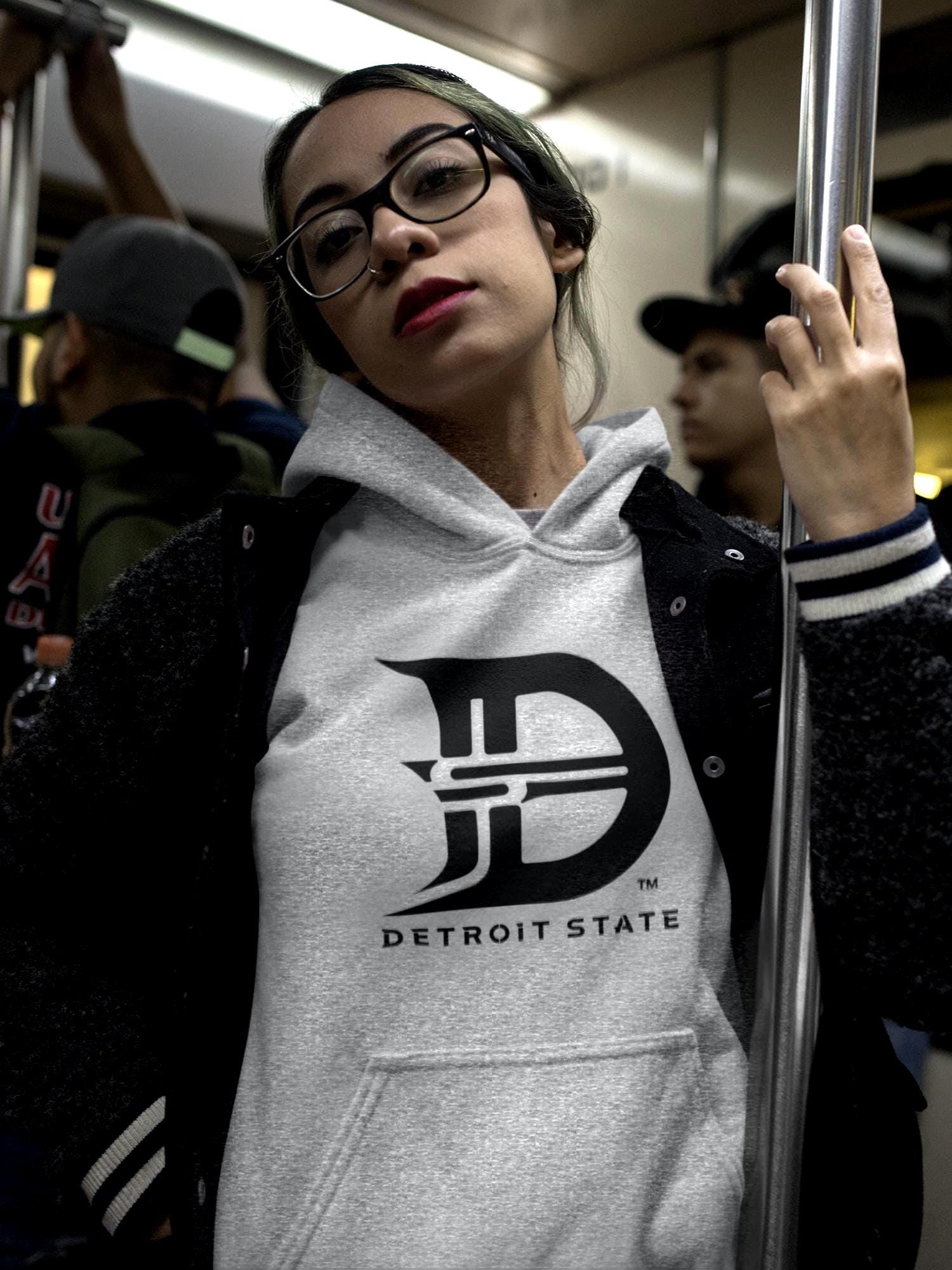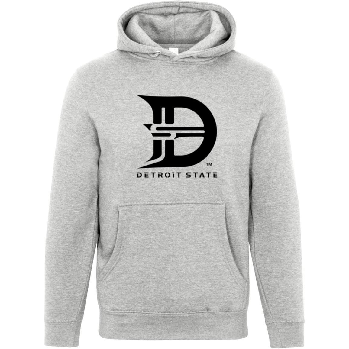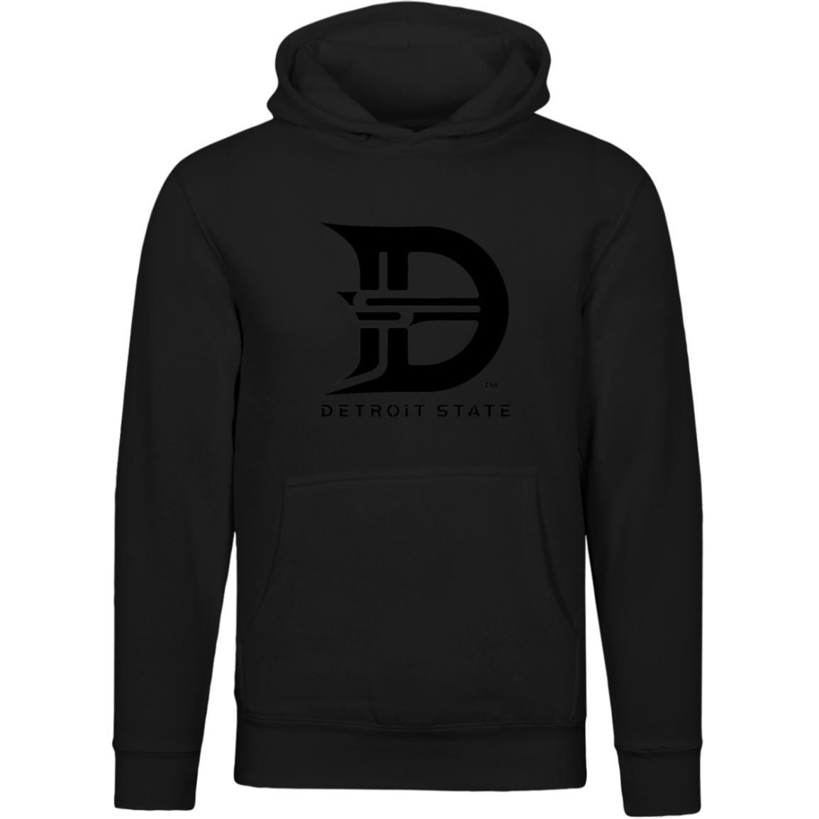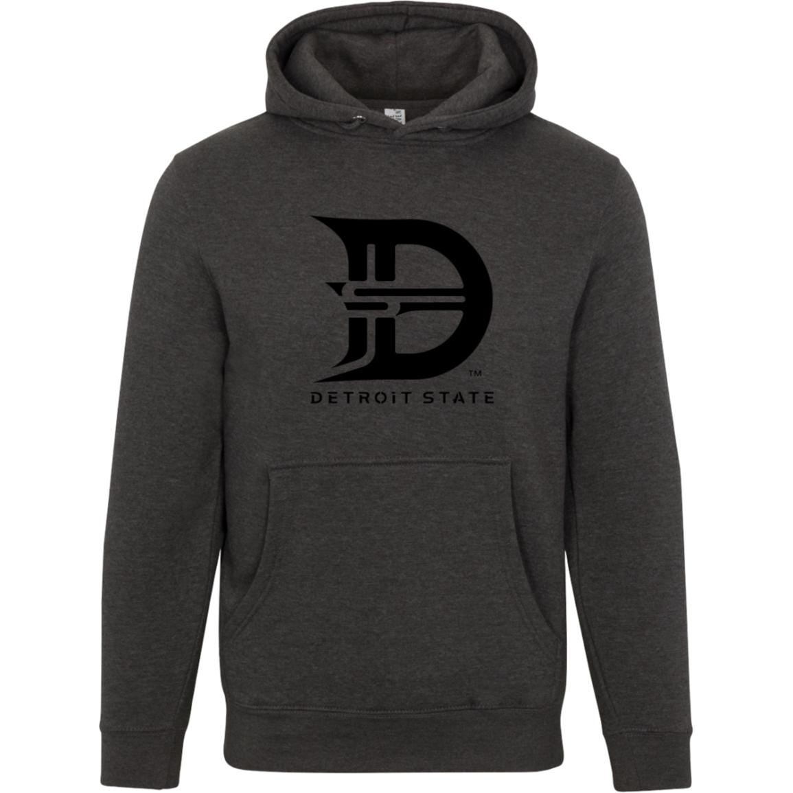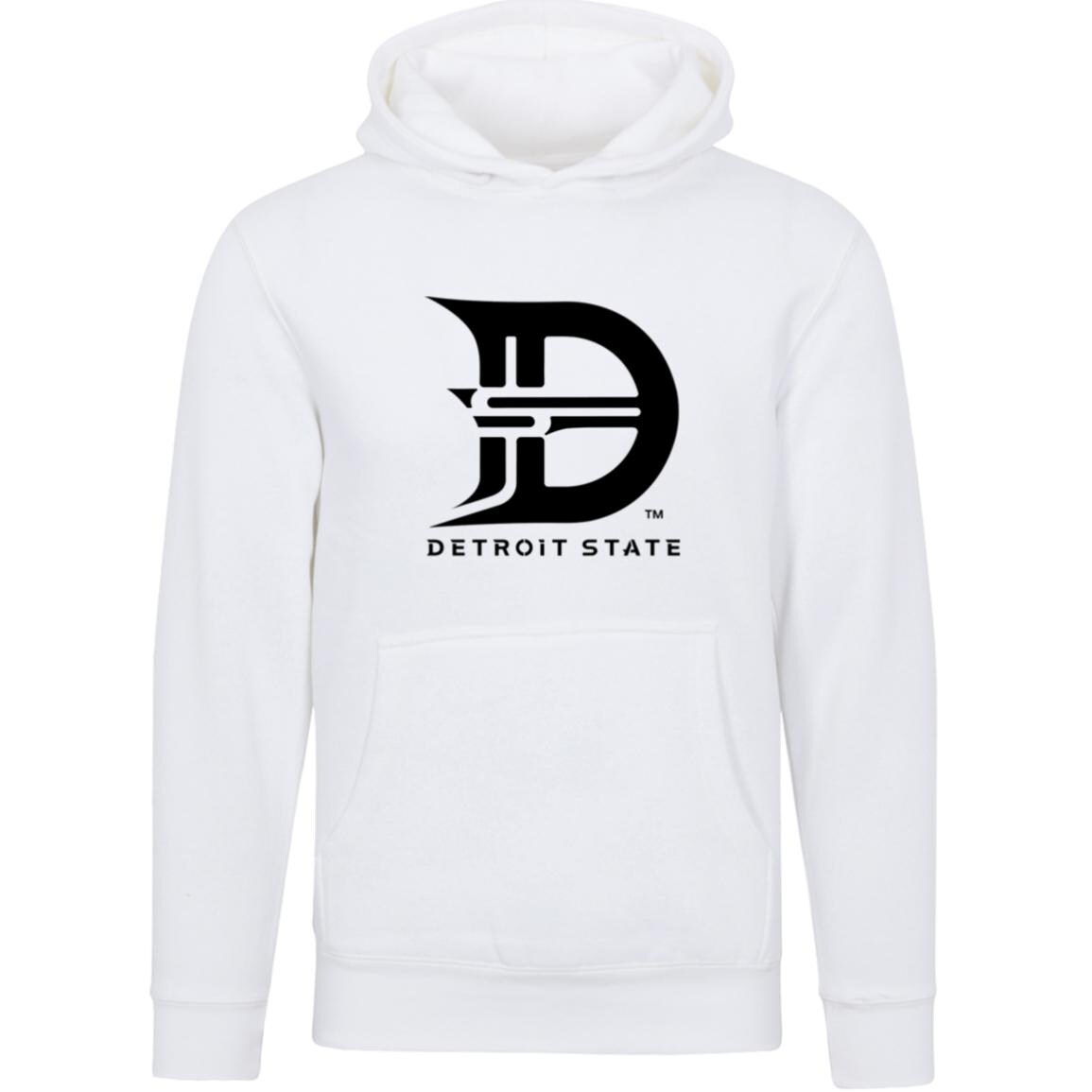 Detroit State™ Branded Premium Hoodie with Black Logo.: Color matched round drawcord with tipped ends and metal eyelets.: 80% Cotton, 20% polyester.: The 3-end fleece.: Print Method: DIGISOFT®