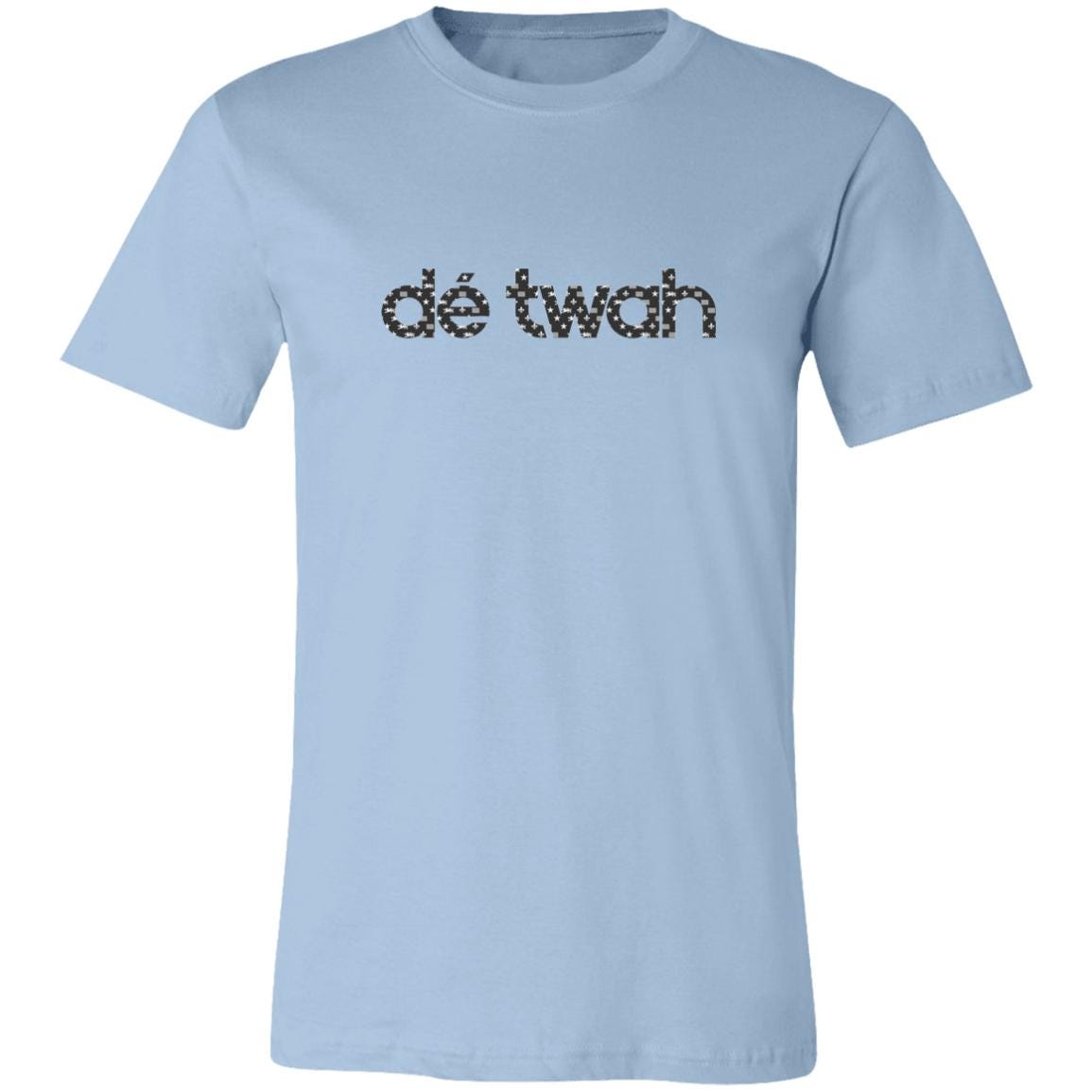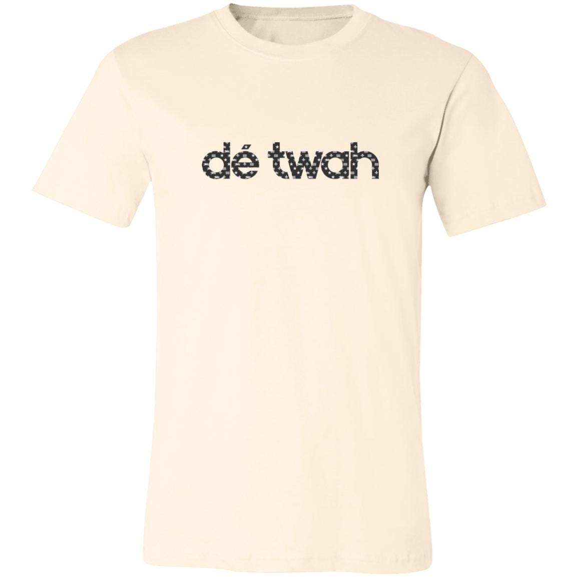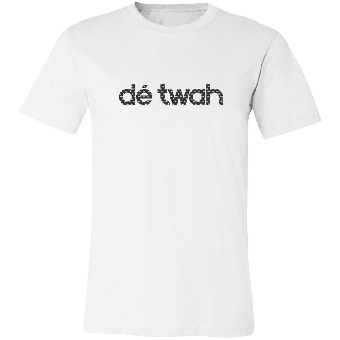 Dé Twah Premium Cotton t-Shirt features a mosaic pattern of elements of the Detroit flag inside the original lettering