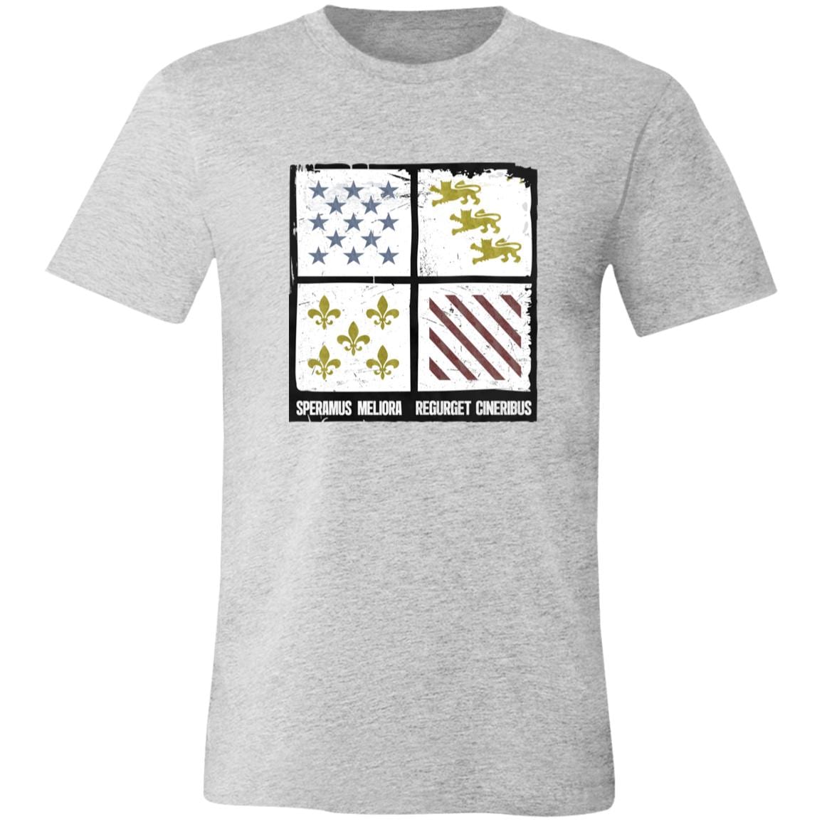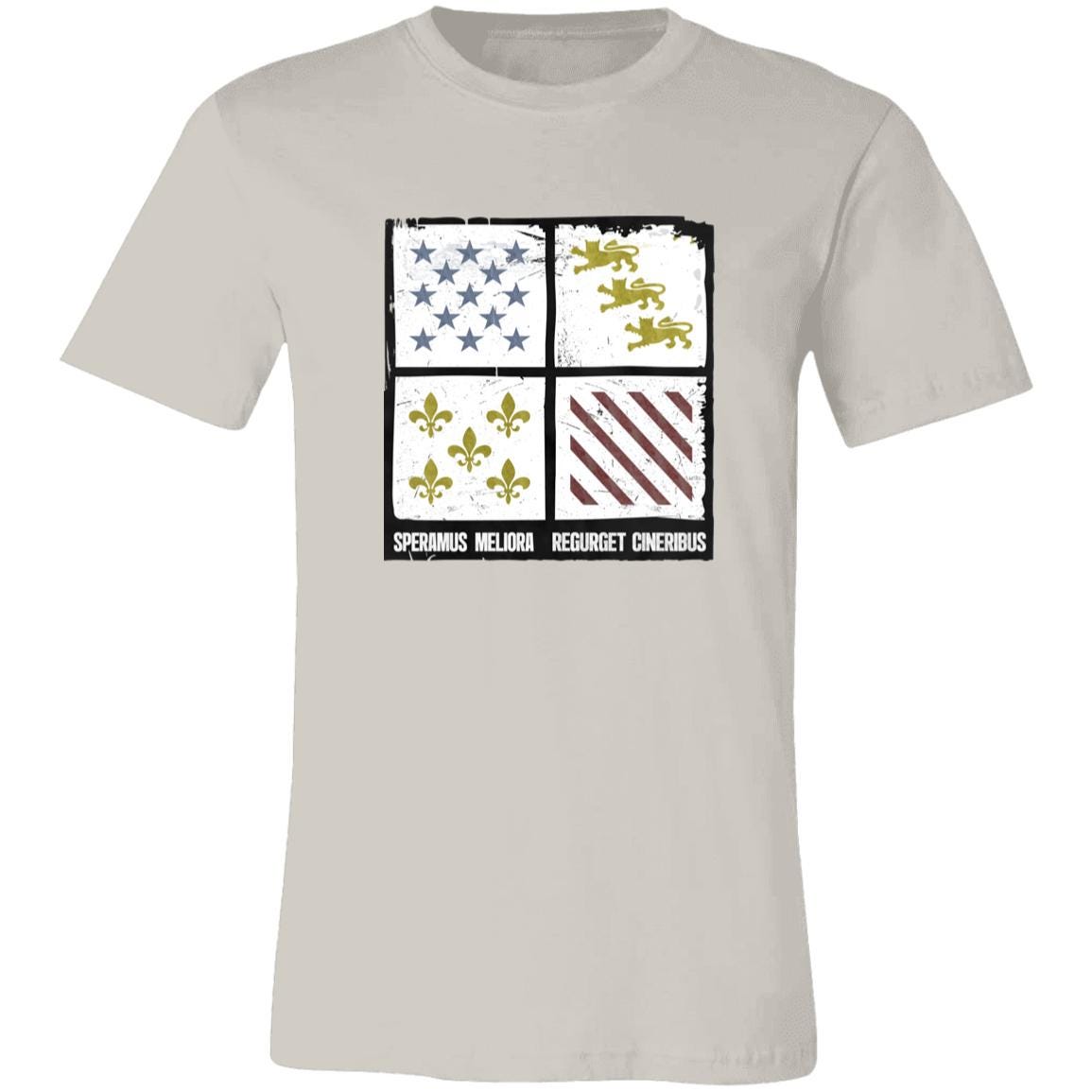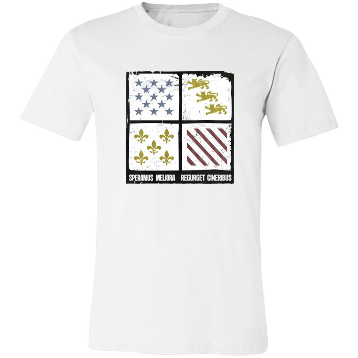 Abstract, distressed interpretation of the Detroit flag quadrants and official motto on a premium cotton T Shirt