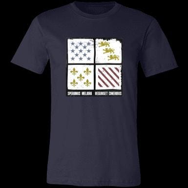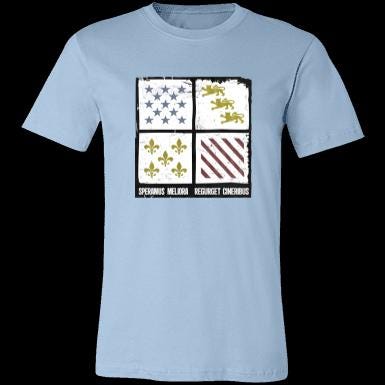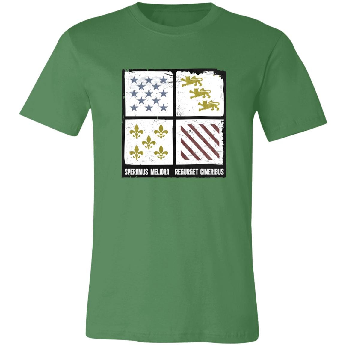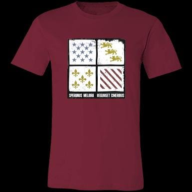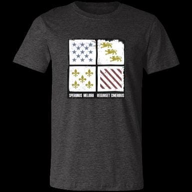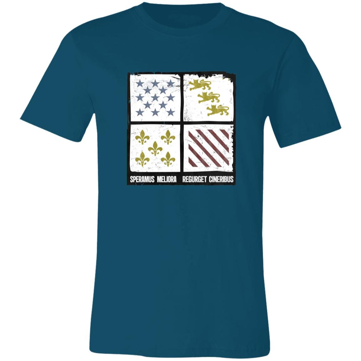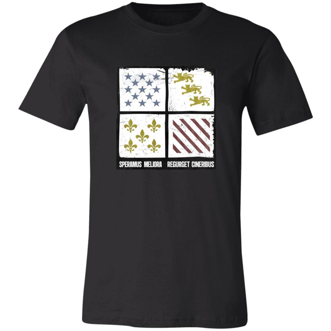 Abstract, distressed interpretation of the Detroit flag quadrants and official motto on a premium cotton T Shirt